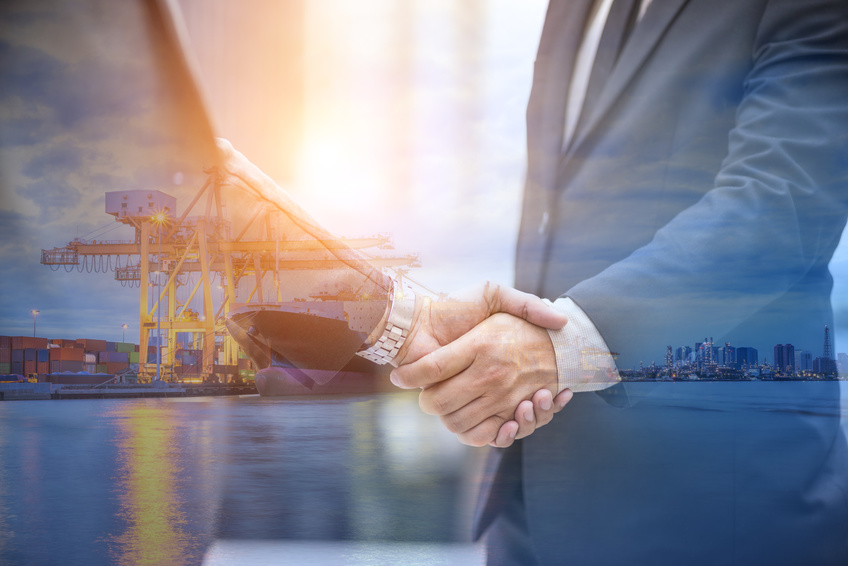Logistic partner, Two businessmen shaking hand with Industrial port loading container, Cargo logistic import and export 18. Juli. 2019